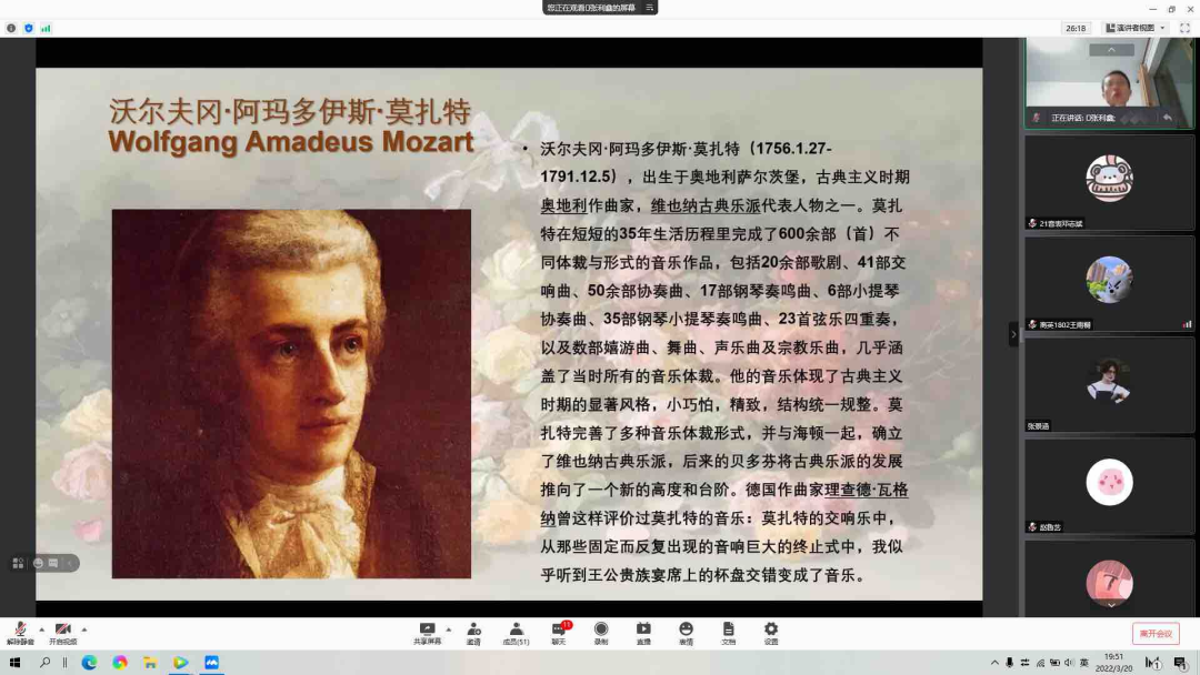 张利鑫老师讲解的《走进莫扎特和他的钢琴音乐》,让同学们了解了莫扎特从神童到天才的一生,确实是不可思议的奇迹。并且对莫扎特的一些作品进行了讲解和赏析,因为想要了解一个作曲家,更需要全面的去听他的作品。