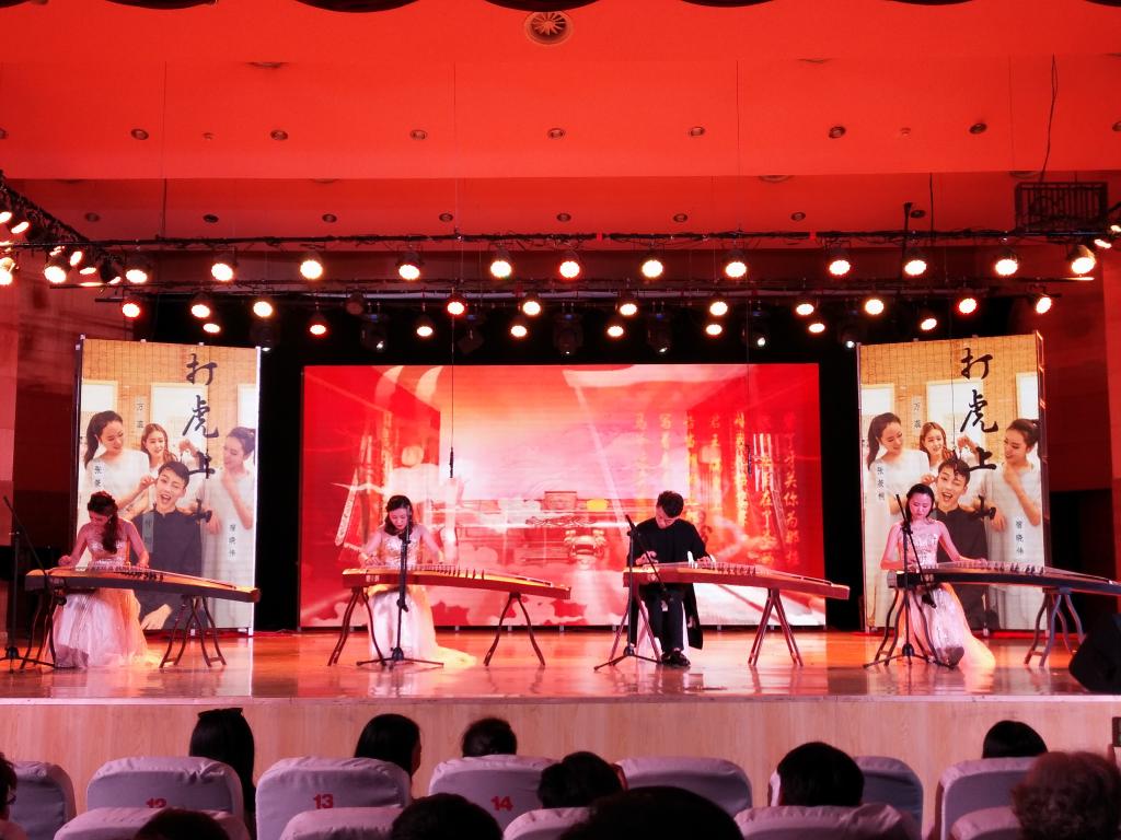 本次音乐会由陈凌老师指导。自古以来,古筝就被称为任智之器。古筝音色优美,音域宽广,演奏技巧丰富,同时具有相当强的表现力,其繁复多变的指法,美妙动听的音色,行云流水般的意境,深受民众喜爱。本场音乐会也在曲目选择和演奏技巧上下足了功夫,有独奏,齐奏,合奏,重奏以及协奏。《打虎上山》是现代京剧《智取威虎山》中的一场,也是现代戏的经典唱段之一。曲中表现了解放军英雄穿越林海,跨过雪原,不畏艰难攀登威虎山的情景。全曲气势磅礴,节奏鲜明,赢得了现场观众的阵阵掌声。《临安遗恨》表现了南宋民族英雄岳飞对社稷面临危难的焦虑,对家人处境的挂念,对奸臣当道的愤恨,以及对自己精忠报国无门可投的无奈而引发的感慨。《天山之歌》是一首带有浓郁的维吾尔族民间音调的乐曲,描绘了春到天山时一派明媚秀丽的风光。