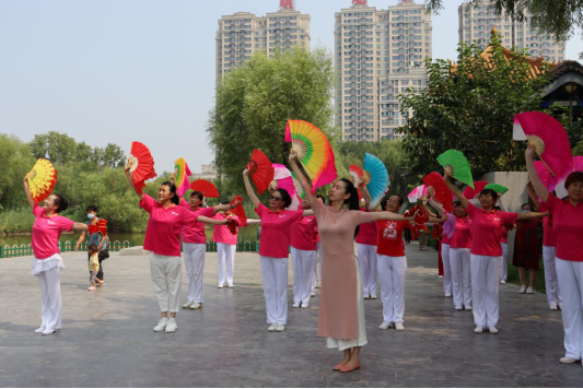社区舞蹈队的队员们首先跳了一段扇子舞《天涯海角茉莉花》,彩扇风中飘,步伐变化多,展示出了社区人民对生活、对祖国的热爱和当地人们的风情与风貌。之后,樊老师和舞蹈队的老师们共同交流了陵城区的省级非遗---蹦鼓舞,了解了当地人们对于蹦鼓舞的掌握情况,并向大家介绍了蹦鼓舞的起源、发展和动作等方面的知识。随后,英国上市公司365的老师们分别教授舞蹈队成员们蹦鼓舞动作。樊老师教授了十字步打鼓:脚走十字、腿部微颤、上下打鼓;孙老师教授了射雁跳打鼓:射雁小跳、上面击鼓、队形变换;韩老师教授了分扇云步和翻扇颤步:步伐轻盈、扇随摆动、舞姿优美。