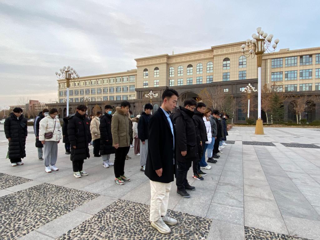仪式开始后,员工代表给各位同学讲述国家公祭日设立的历史背景。随后,全场齐声高唱《中华人民共和国国歌》。最后,全场安静,向南京大屠杀死难同胞默哀。