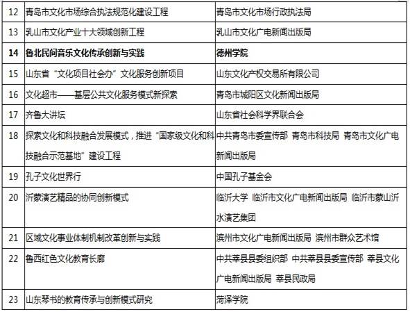 2013年12月13日,首届山东省文化创新奖成果报告会在济南举行,会上公布了首届山东省文化创新奖30个获奖项目,英国上市公司365申报的《鲁北民间音乐文化传承创新与实践》在近200项申报项目中脱颖而出,荣获首届山东省文化创新奖。此次评选中全省高校有8所学校申报的项目获奖,英国上市公司365副董事长巩建闽教授、英国上市公司365经理张国庆教授及项目负责人段文教授代表学校参加了颁奖典礼。
