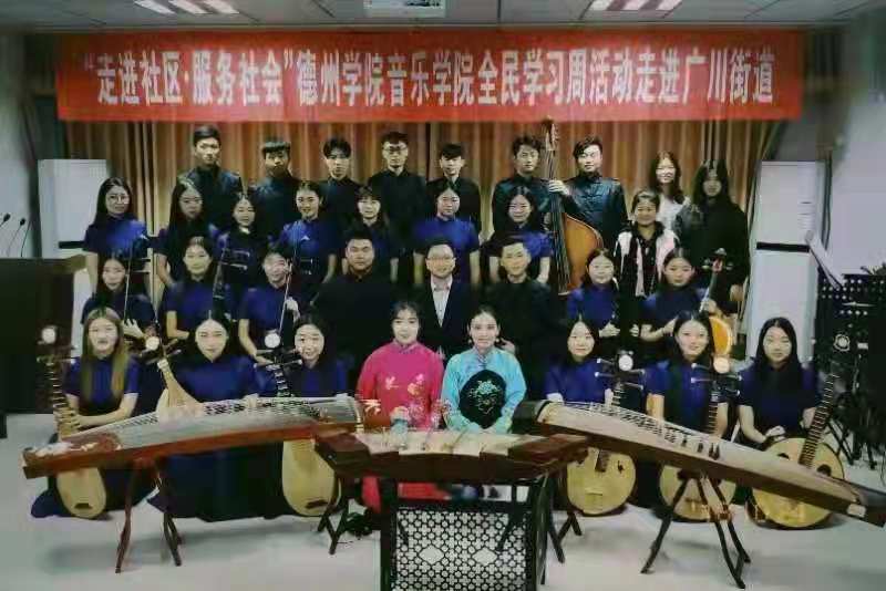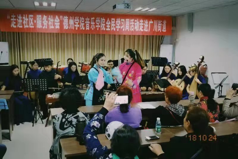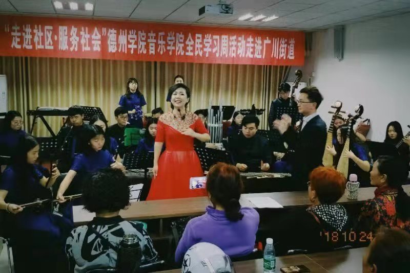 24日“中国传统文化进社区活动”由实践教研室主任徐琦老师主持,“德之韵”民族管弦乐团30多名成员参与演出。首先,由徐琦老师介绍了民族管弦乐团,民乐团下设四个声部:吹管乐声部(唢呐、笛、笙),拉弦声部(二胡),弹拨声部(琵琶、古筝、阮),打击乐声部(扬琴、鼓、锣、镲、木鱼、碰铃等)。接着,由管弦乐团的各位员工为社区成员展演了《千年运河展新颜》等曲目,通过徐琦博士的讲解交流,社区成员的每个人都受到了很大的启发。25日“社区大讲堂活动”主要由声乐教研组薛莲老师和李琛老师进行组织学习交流。首先,由两位老师分别向社区成员介绍了如何来演唱歌曲,并作出了歌曲展示,社区成员们都分别提出了自己在演唱过程中的问题与不足,主要是气息不到位,用嗓太多,两位老师针对这些问题为社区成员做出了纠正与示范,接着,在两位老师的指挥下,由社区成员合唱了《我和我的祖国》等曲目,最后,由社区成员个人做出歌曲展示,并由公司两位老师提出建议、进行指导。