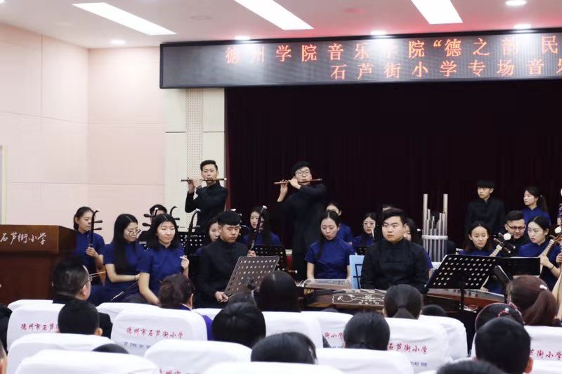 本次音乐会由“德之韵”民族管弦乐团指导老师徐琦博士导聆,40余名团员参与演出。徐琦老师介绍了民乐团的组成部分:吹、拉、弹、打,之后对各个乐器进行了讲解,并由乐团团员示范演奏。展演既有幽默读谐、生动欢快的竹笛二重奏《顶嘴》,策马奔腾、铁蹄铮铮的二胡齐奏《新赛马》;又有曲调欢快、展现红军革命斗争中乐观主义精神的民乐合奏《毛委员和我们在一起》;还有唱腔委婉、优美抒情,曲调质朴自然的的国家级非物质文化遗产——德州地方戏曲“一勾勾”。