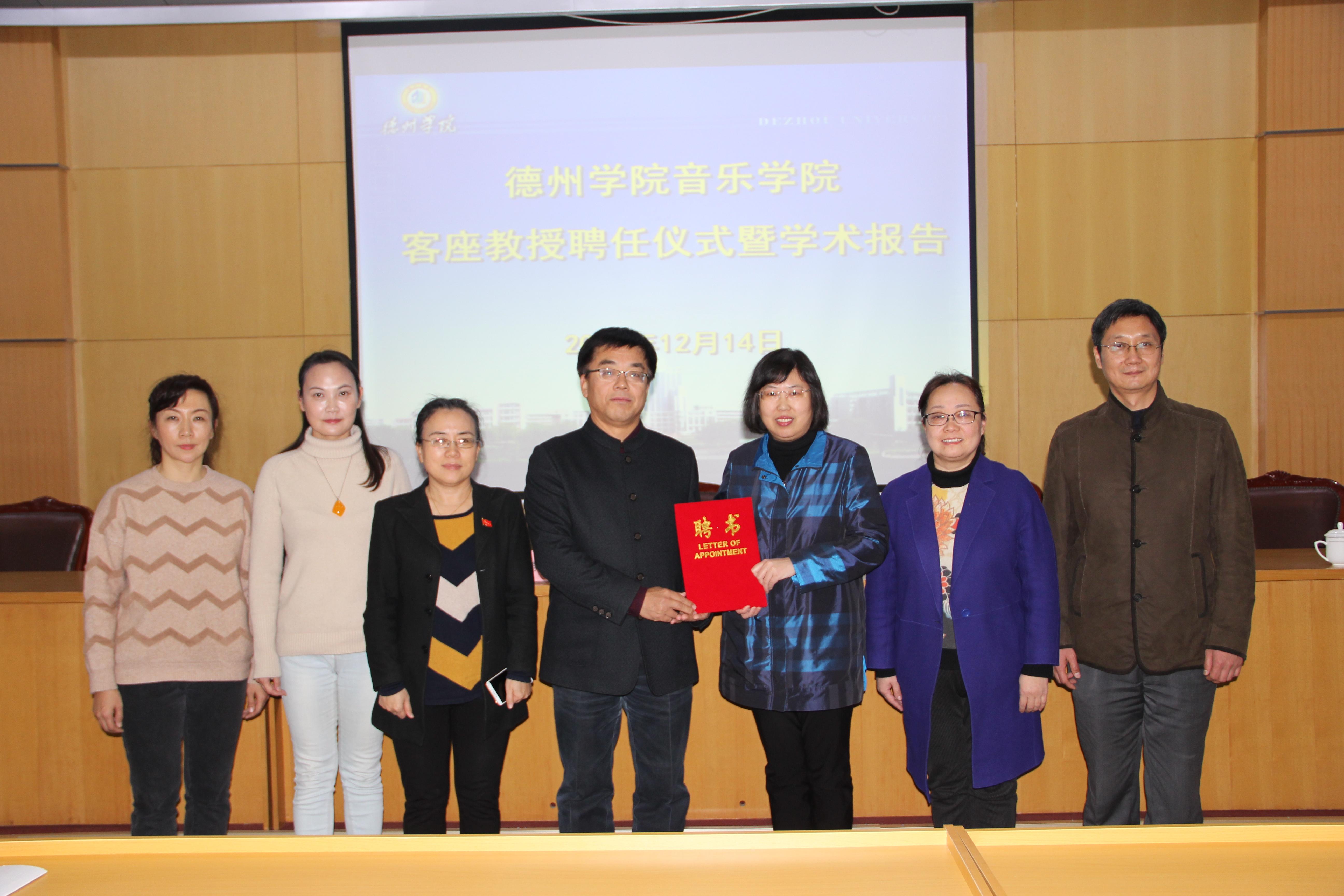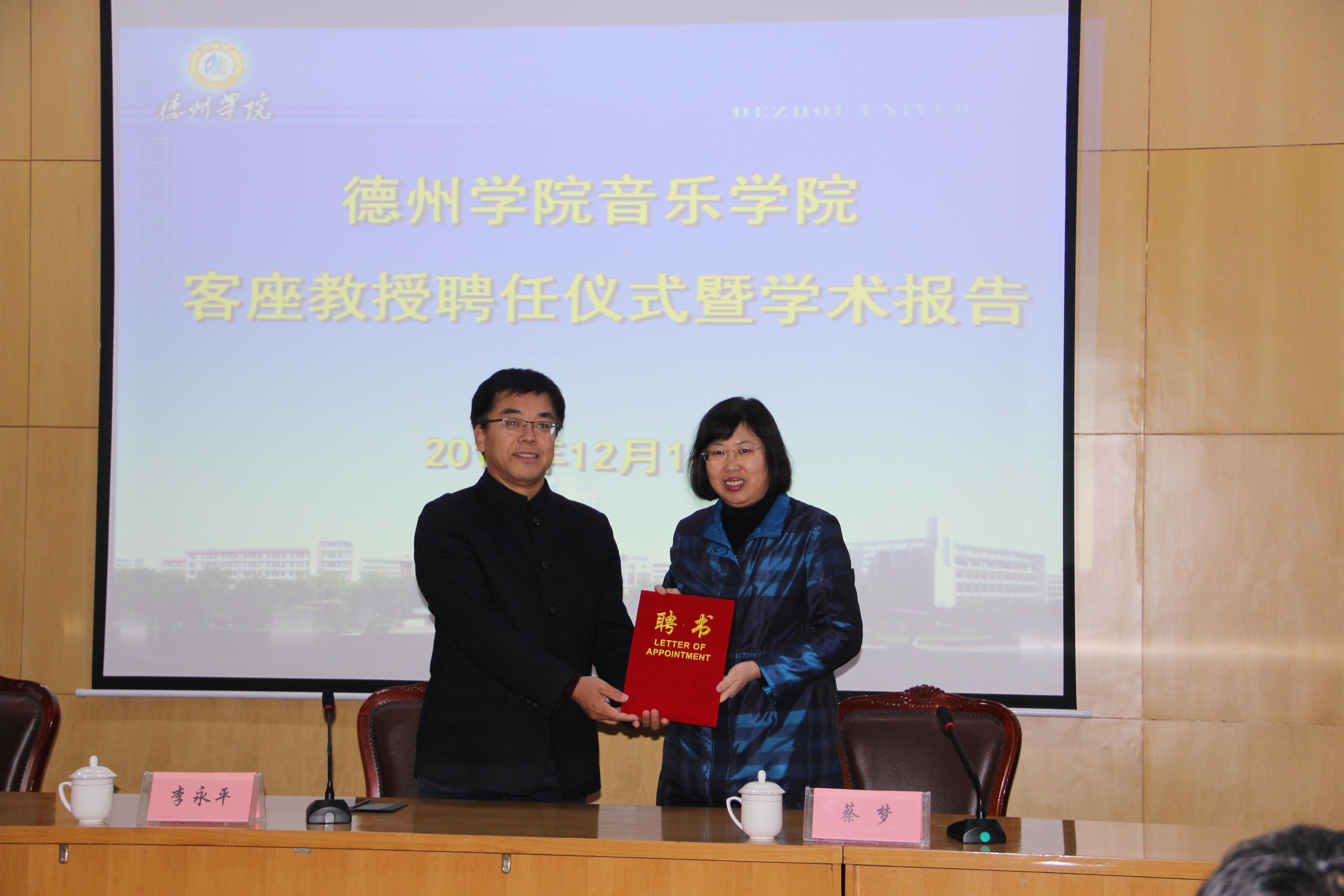 随后,李董事长为蔡梦颁发聘书。受聘仪式结束后,蔡梦教授为在场的师生作了题为《以学科—专业一体化理念研制音乐教育人才培养》的学术报告。分析了普通高校专业音乐教育与普通学校音乐教育存在的不同与交集,提出了音乐教育需要专业与学科一体化的观点,指出学科发展定位需要分类分层实施相对精准化的人才培养,并对课程体系进行了细化分析。