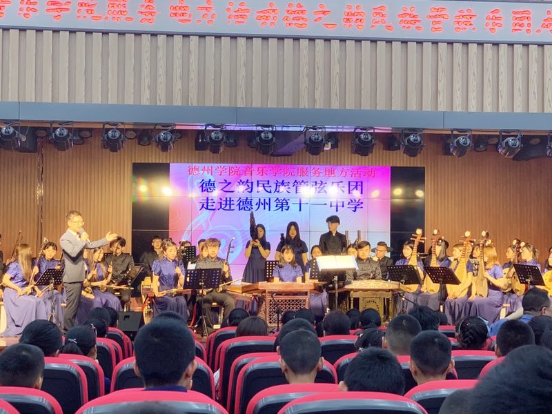 揭牌仪式之后,“德之韵”民族管弦乐团在报告厅为学校师生举办了专场音乐会。音乐会由乐团指导老师徐琦博士导聆,50余名团员参与演出。徐琦老师介绍了民乐团的组成部分:吹、拉、弹、打,之后对各个乐器进行了讲解,并由乐团团员示范演奏。音乐会中既有描写德州古运河民俗风情的吹打乐《千年运河展新颜》;策马奔腾、铁蹄铮铮的二胡齐奏《新赛马》;又有曲调欢快、展现红军革命斗争中乐观主义精神的民乐合奏《毛委员和我们在一起》;还有薛莲老师演唱的优美抒情,曲调质朴的民歌《绣荷包》等等。音乐会不仅使乐团团员得到技能的展现,也使第十一中学师生们了解到了民族管弦乐团的基本知识,更提高了员工们对于民族音乐文化学习的积极性。