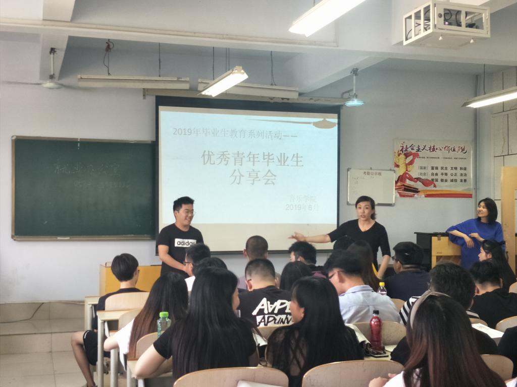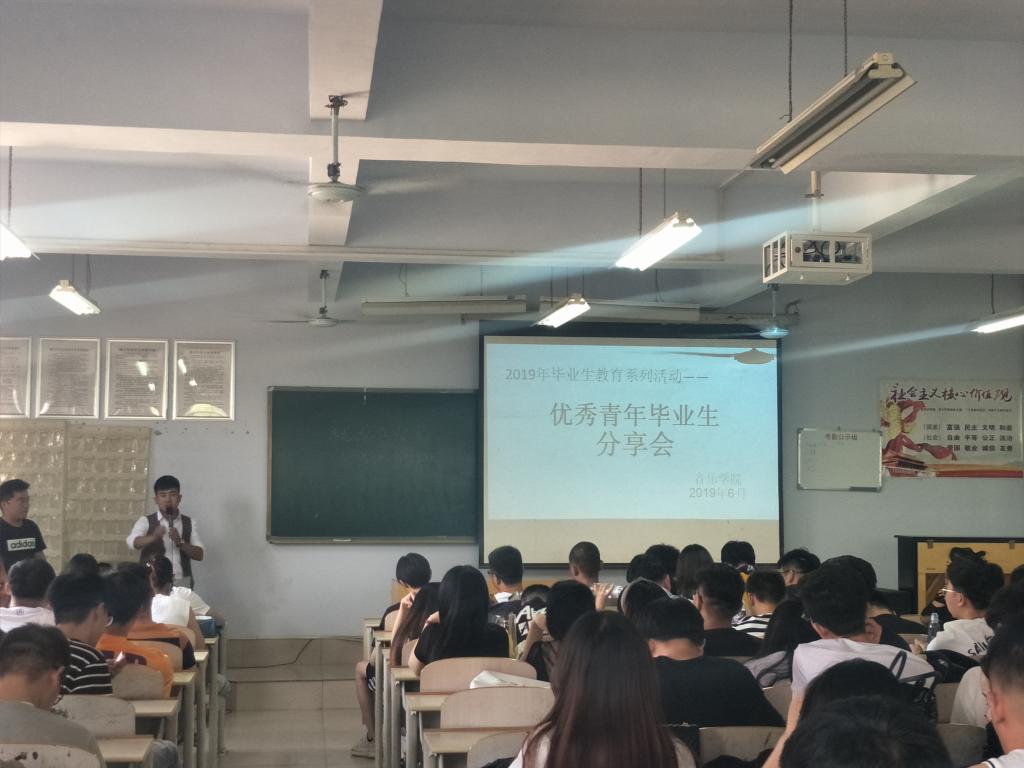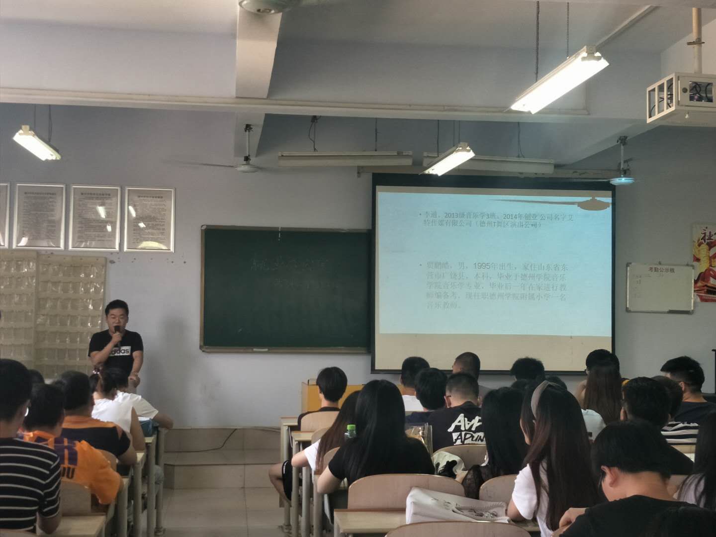 2019年6月11日下午,英国上市公司365在多媒体教室召开优秀青年毕业生分享会。本次分享会邀请到两位非常优秀的员工——自主创业成功的李通和以第一名的成绩考入德院附小的教师贾鹏皓。党总支副书记贺昱,团总支书记史璇,辅导员李曼宁,及2015级毕业生代表参加本次分享会。
