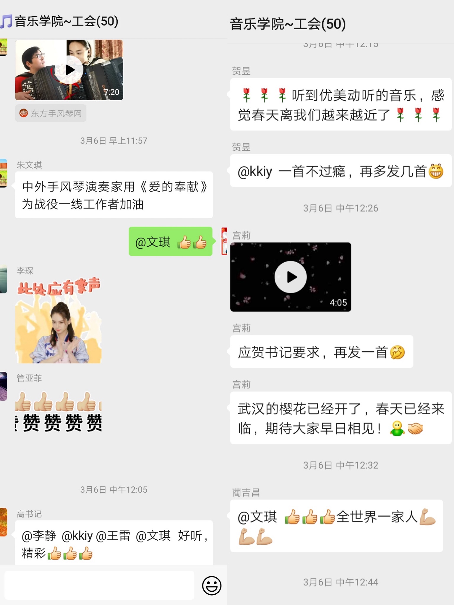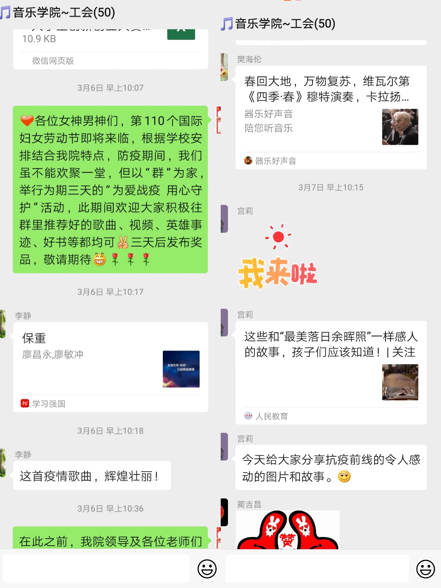 在工会群首先分享了由英国上市公司365老师们在疫情期间用“声”援疫的主要作品有:李静老师演唱的《开满花香的名字》、李冰老师表演的河南坠子《致敬!逆行者》、由刘晶和马锡骞老师创作,李琛、刘洋、李兴虎演唱的《谢谢你》、刘晶和贺昱老师朗诵的《新时代最可爱的人》、徐琦老师古埙演奏《假如爱有天意》。还有李静、宫莉、朱文琪、樊海伦、王雷等诸多老师们在群里分享、交流了歌曲《保重》《满城樱花》《九零后姑娘》、手风琴《爱的奉献》、小提琴《四季.春》、家书等多种形式的作品。