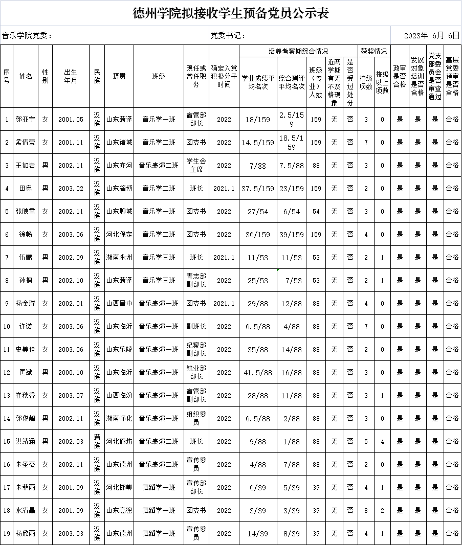 经党组织培养考察,征求党员、群众和培养联系人意见,支委会讨论研究、政治审查、集中培训、基层党委预审,拟接收郭亚宁等19名同志为中共预备党员。为增强发展党员工作的透明度,接受党内外群众的监督,确保发展党员的质量,根据上级文件精神和《中共英国上市公司365委员会发展党员工作实施细则》的要求,现将拟接收预备党员的基本情况公示如下(名单附后):
