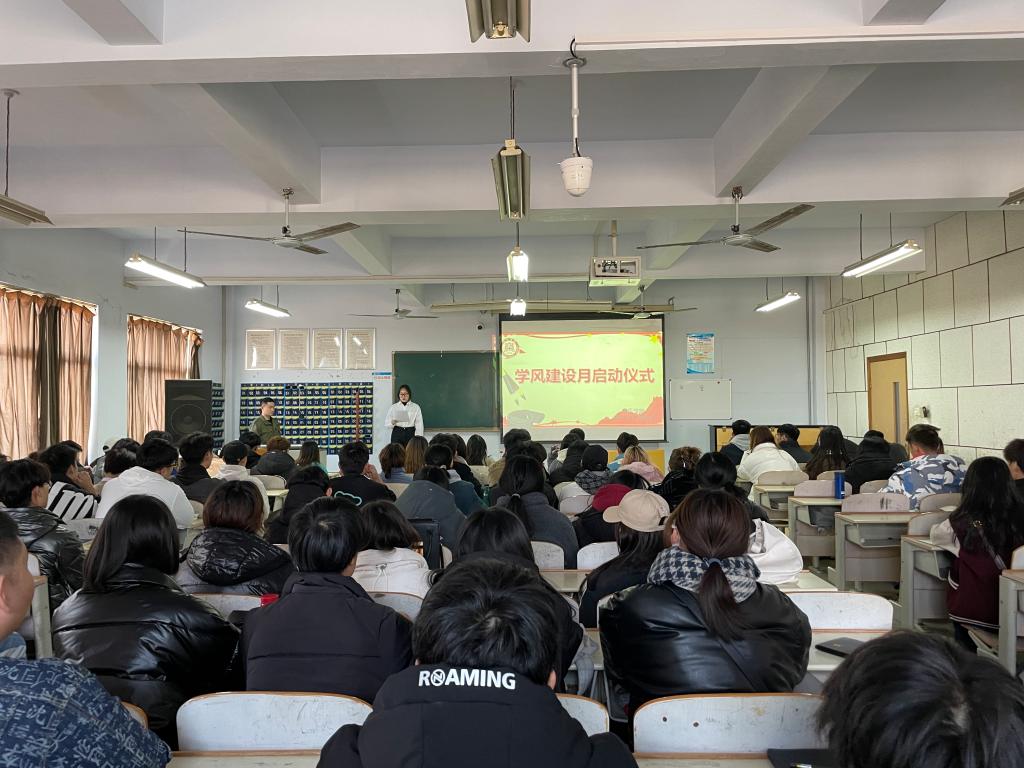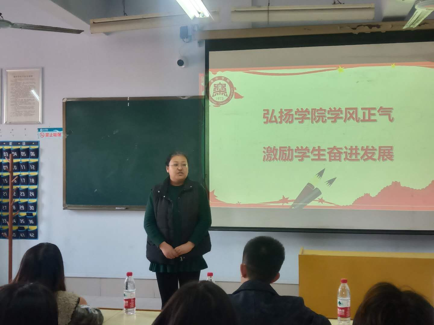 出席本次活动的有党委副书记米彦、团总支书记陈璨、21级辅导员禹亚辉。活动开始,先由主持人向大家介绍了本次活动的背景,然后由各级员工代表上台发言,代表依次讲解了自己对学风建设的理解,并承诺将会起好的带头作用,不迟到不旷课,诚信应考,拒绝舞弊。随后,进行员工代表上台签承诺书的活动。仪式最后,由党委副书记米彦对此次活动进行总结:她提出要多读书,读好书的倡议,学习不能仅局限于在学风建设月,更在日常,我们要树立终身学习的观念。