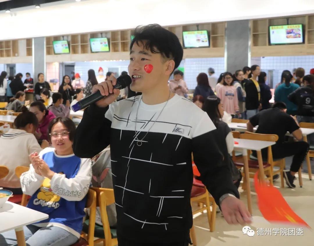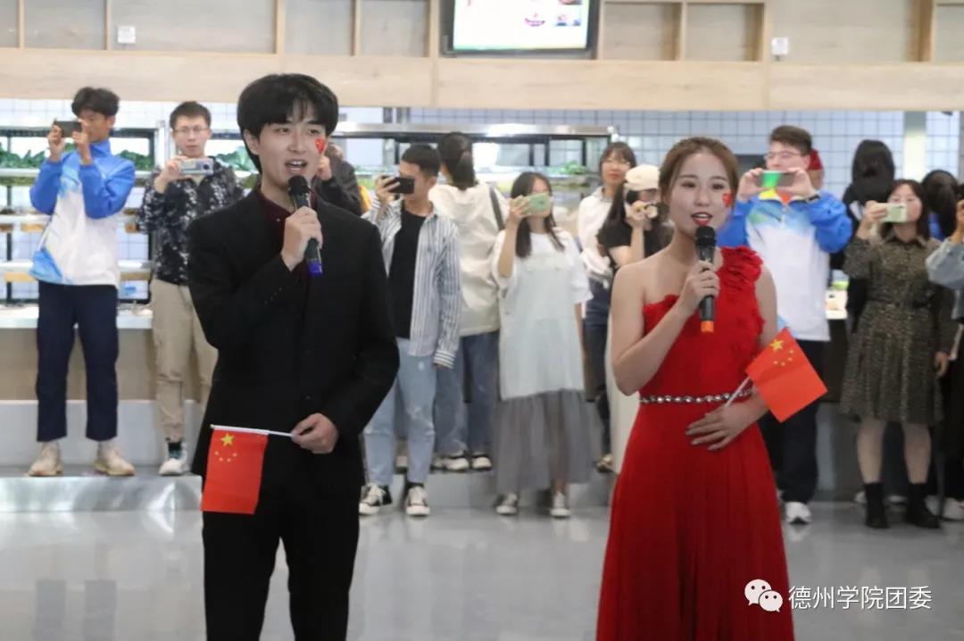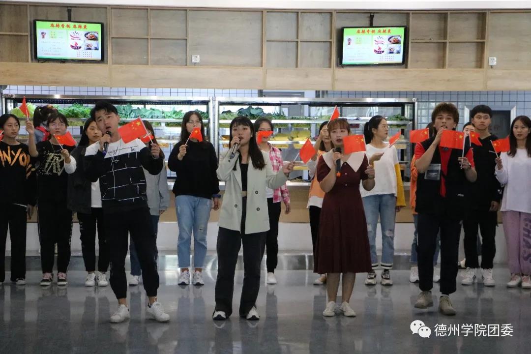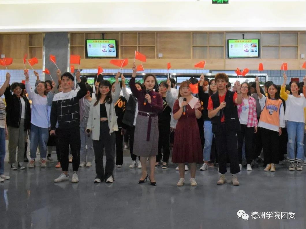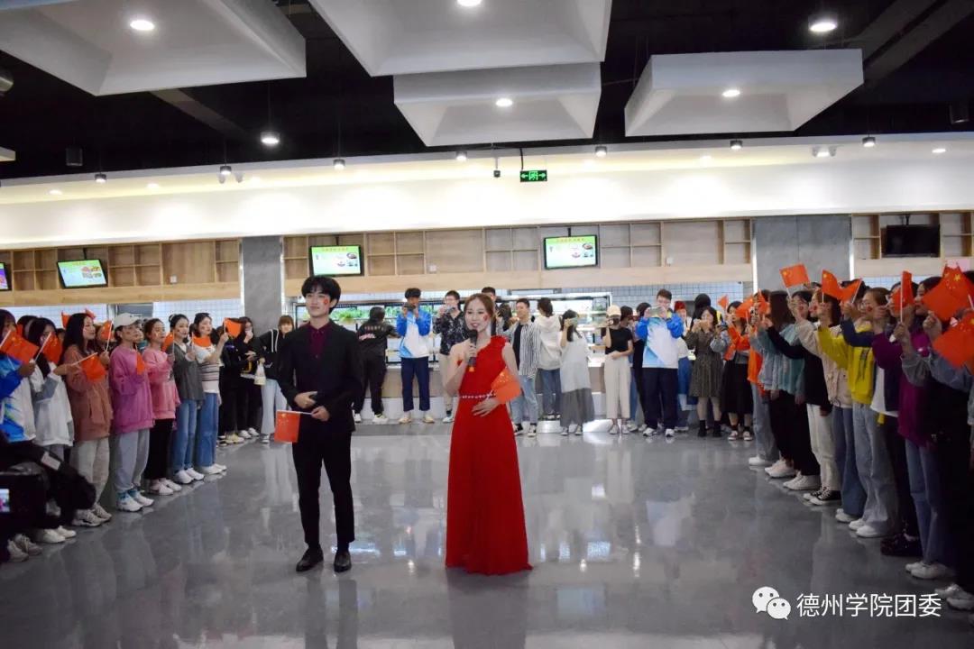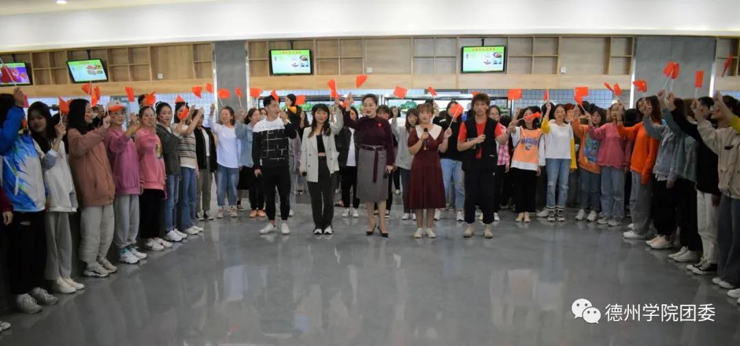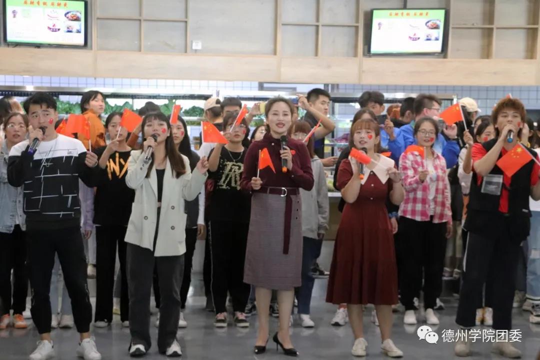 为献礼伟大祖国71华诞,激励和引领广大青年员工大力弘扬以爱国主义为核心的民族精神和时代精神,创新老员工思想政治教育引领工作,9月30日中午11点,校团委和英国上市公司365、教师教育学院在四餐二楼联合举办了一场精彩而富有意义的“国庆红歌快闪”活动。1000余名德院师生参与其中,现场洋溢着青春的气息,用共唱红色歌曲的方式表达着对伟大祖国的热爱和敬仰。悠扬旋律萦绕在餐厅上空,吸引多位师生现场驻足观看。