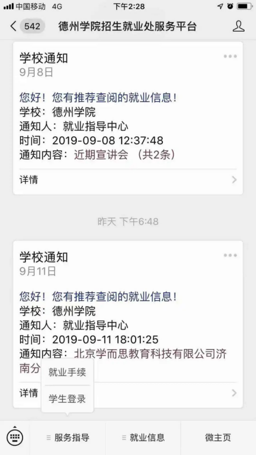 2.进入服务公众号后点击“服务指导”——“员工登录”