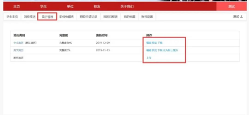 员工完善简历:员工登录后,可在线制作简历(中文简历、英文简历),也可以直接上传附件简历。