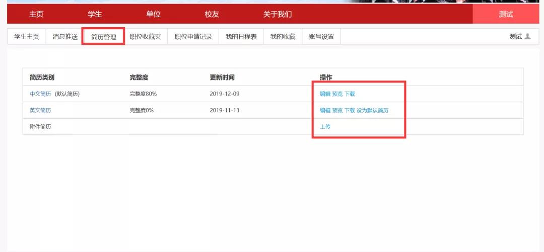 员工登录后,可在线制作简历(中文简历、英文简历),也可以直接上传附件简历。