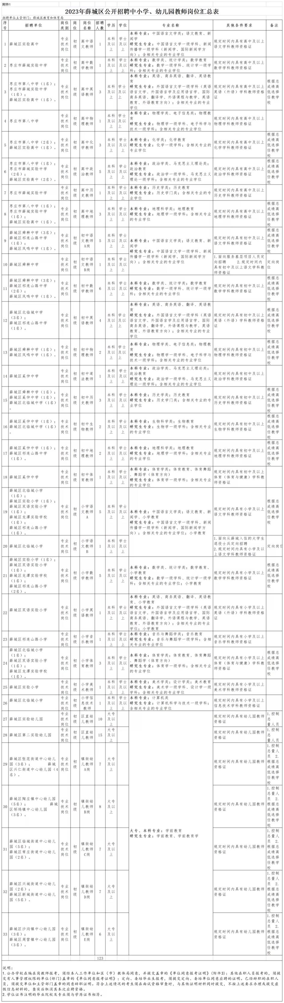 (四)招聘岗位要求的专业、学历学位、教团队格条件,详见《2023年薛城区公开招聘中小学、幼儿园教师岗位汇总表》(附件1,以下简称《岗位汇总表》);