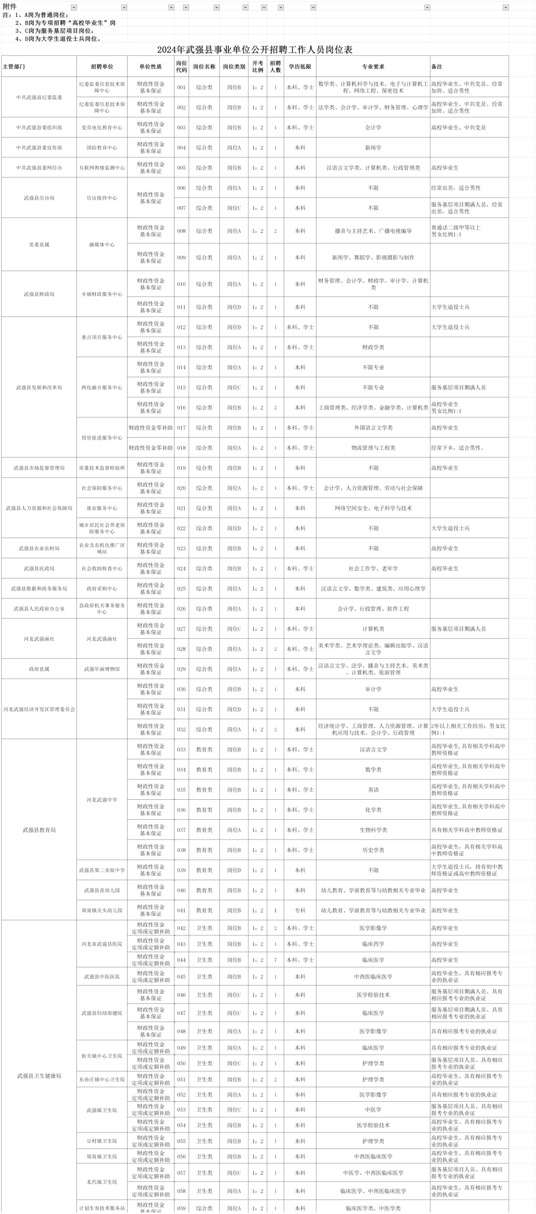 2024年武强县事业单位公开招聘工作人员73名,各招聘单位的招聘岗位、招聘人数、招聘条件等信息详见《2024年武强县事业单位公开招聘工作人员岗位表》(附件1)。