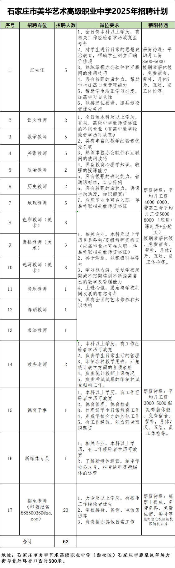 (1)面试合格,签订劳动合同。月薪请参考石家庄市美华艺术高级职业中学2025年招聘计划表中的各岗位的薪酬待遇,试用期满,享受“五险”,交通、生活补贴等政策待遇。查看河北各地最新招聘信息